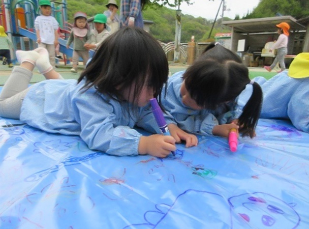 「今日はこのスモックを着てからお絵かきしようね」と製作用のスモックを着て、用意されたペンを手に思い思いにお絵描きが始まります。