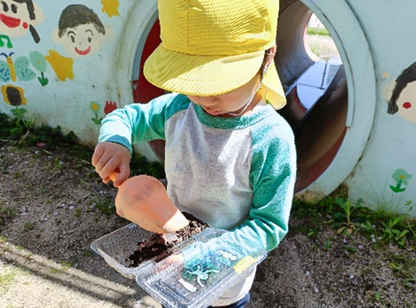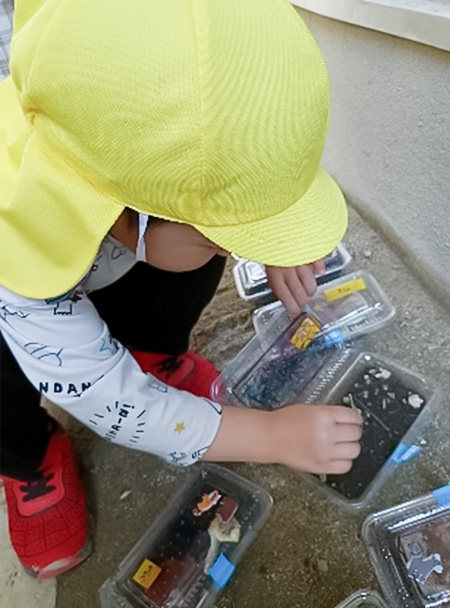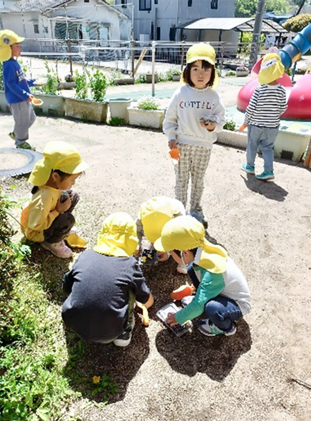 「あ!だんごむし見つけた~」の声に、「どこどこ?」と頭を突き合わせて地面をのぞき込む姿も。