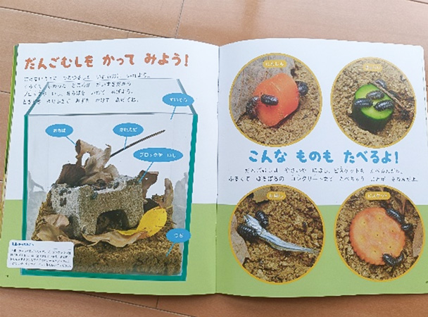 「だんごむしをかってみよう!」のコーナーには、ダンゴムシが色々な物を食べることが載っています。きりん組さんたちは月刊絵本を読んで、