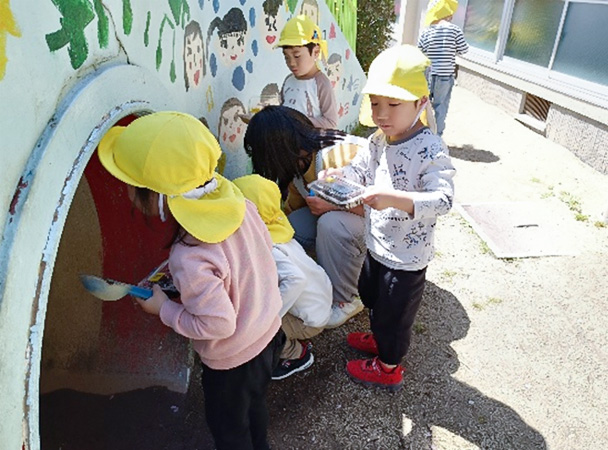 うさぎ組さんの時の冬に植えていた玉ねぎが大きくなり収穫体験をしました。 どれくらいのご飯をラップに盛ろうか悩みながら作る子どもたち。 具もこだわって選びました!