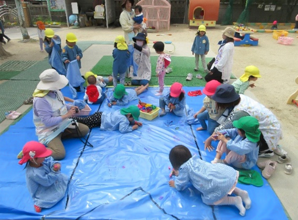 「今日はこのスモックを着てからお絵かきしようね」と製作用のスモックを着て、用意されたペンを手に思い思いにお絵描きが始まります。